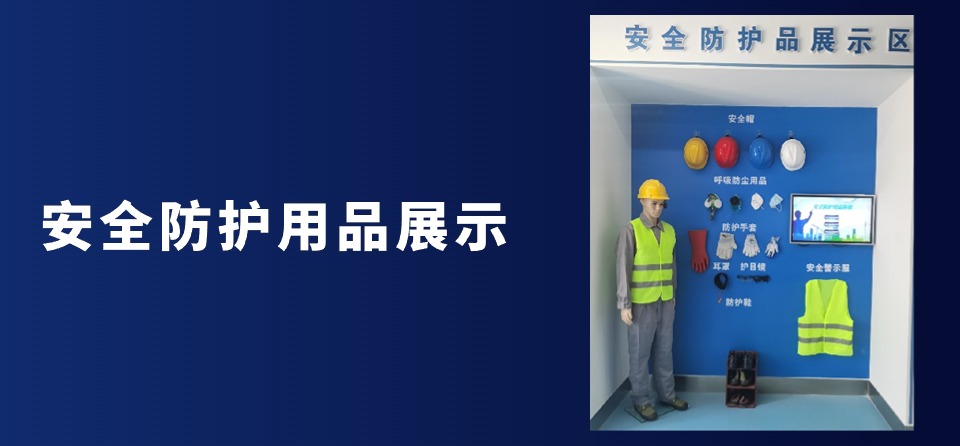 安全防护用品展示,和实物展示配合使用。包含安全生产常见的安全帽、呼吸防尘用品、防护手套、耳罩、护目镜、防护鞋、安全警示服、以及破拆工具的介绍及相关科普视频。搭配一体机展示防护用品穿戴互动、防护用品知识