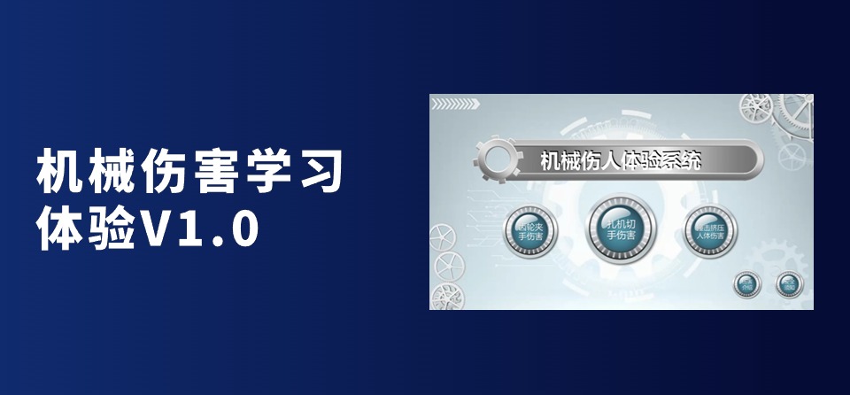 机械伤害学习体验V1.0,通过触摸屏控制系统实现人机互动体验,体验齿轮夹手伤害、轧机切手伤害、撞击挤压人体伤害,真实了解机械伤害的危害,通过观看视频对机械伤害的危险性有深层次的了解,提高工厂生产安全意识。