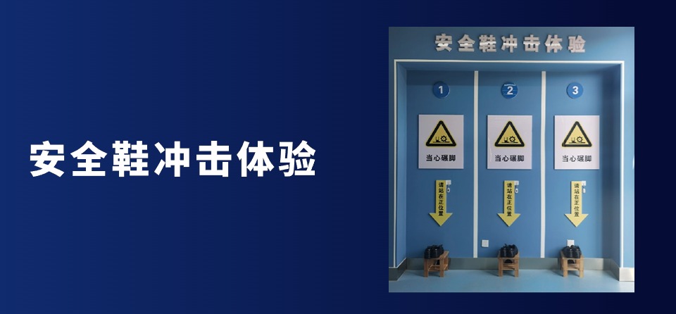 安全鞋体验区的系统由镀锌钢结构、模板、油漆、广告布和CI组成。该培训旨在让体验者正确穿戴安全鞋并了解安全鞋的重要性。体验者需将安全鞋头部放置于撞击棒下,进行撞击,以体验安全鞋对脚部的保护作用,加强在施工