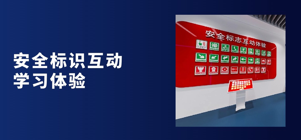安全标识互动学习体验,是展示在生产中常见的安全标志,如禁止标志、指令标志、警告标志等。并结合32个灯箱进行展示。在软件中选择哪个标志,相应的灯箱被点亮,同时还配有语音讲解功能。该软件还包含了知识拓展和知