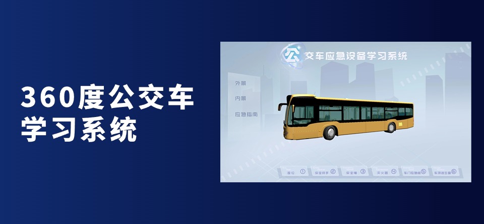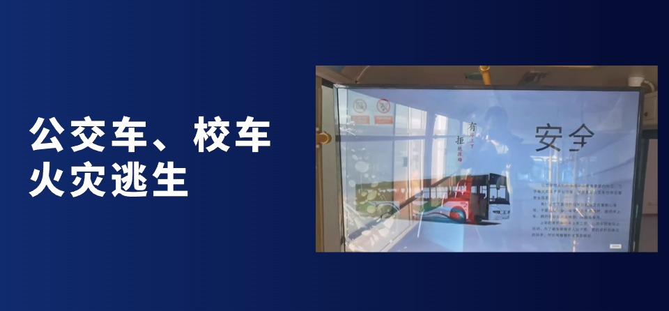 360度公交车学习系统,系统体验包含车辆消防安全、车辆火灾逃生知识,体验者通过观看逃生视频和逃生标志提醒,了解应急逃生技能。