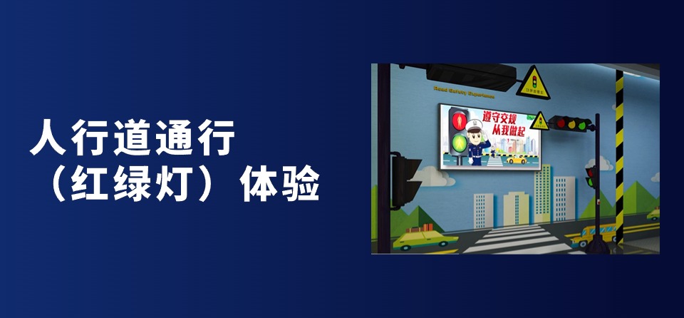人行道通行(红绿灯)体验,通过红外感应、3D技术,模拟真实的交通十字路口场景,体验者亲自体验遵守交通规则与闯红灯,通过闯红灯后触发播放交通事故的视频,让体验者认识到不遵守交通规则的危害,达到安全教育的作