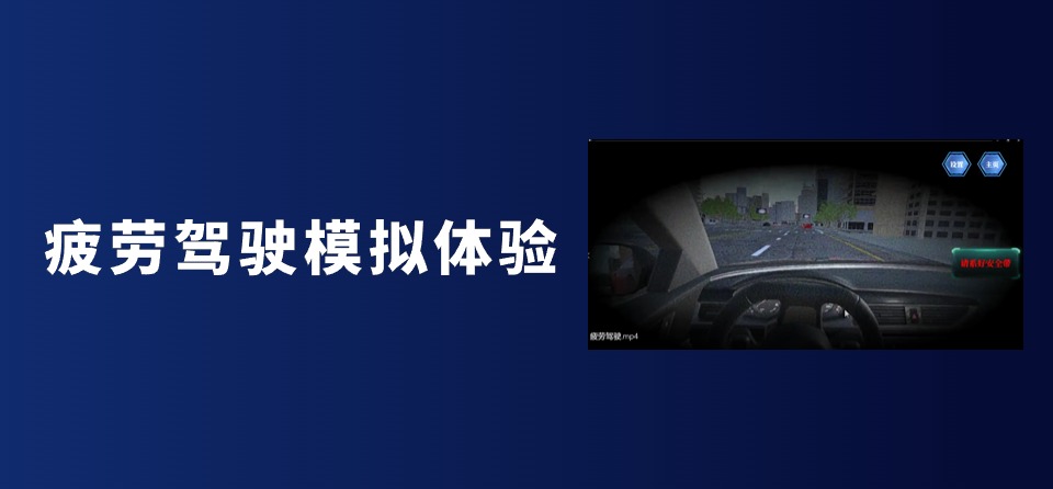 疲劳驾驶模拟体验,模拟开始前,会出现疲劳驾驶的相关介绍及行为危害。开始行驶,模拟疲劳驾车感觉,视觉涣散,看不清道路,画面变黑,可视范围减小,提示逆行,因判断能力降低看不清路线而导致车祸,发生事故后的安