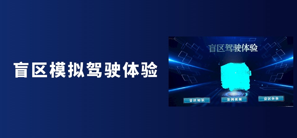 盲区模拟驾驶体验,分为“盲区知识”、“案例视频”和“盲区体验”三大模块。盲区知识:里面包含货车,轿车两种车型的盲区讲解,共六个盲区,点击对应盲区后会显示相关的文字讲解和案例视频。案例视频:点击进入案例