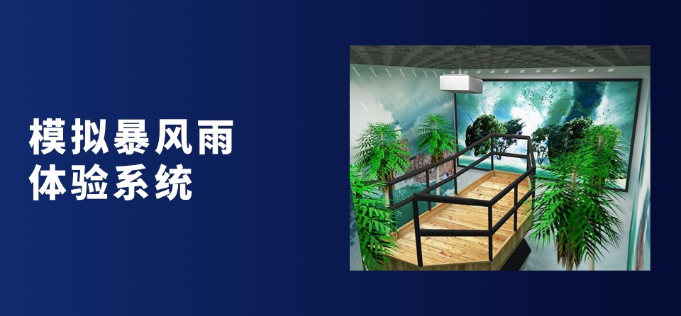 模拟暴风雨体验系统,沉浸式暴风雨体验根据台风现象,采用先进的多媒体和实景结合技术,模拟台风登陆城市的景象,在真实的空间里模拟12级台风,使体验者有身临其境的感觉。台风体验项目体验者穿上雨衣进入体验区域,
