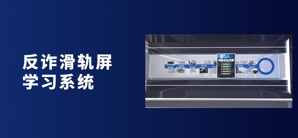 反诈滑轨屏学习系统,反诈互动滑轨屏主要由定制的滑行轨道、红外感应器、触摸屏、计算机、灯箱等组成。这样当滑行时便可以在触摸屏里面展示与展墙图片相关的反诈骗知识,通过此设备可以学习更多的反诈骗知识。